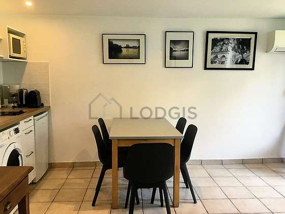 Cet appartement dispose d'une magnifique cuisine avec du carrelage au sol et tout l'équipement essentiel pour votre quotidien : plaques de cuisson, réfrigerateur, congélateur, micro ondes, micro onde combiné, grille pain, table à manger, vaisselle.