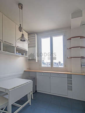 Cet appartement dispose d'une magnifique cuisine avec du carrelage au sol et tout l'équipement indispensable pour votre quotidien : plaques de cuisson, réfrigerateur, congélateur, micro onde combiné, grille pain, bouilloire électrique, cafetière, table à manger, etagère, placard, vaisselle, tabouret.