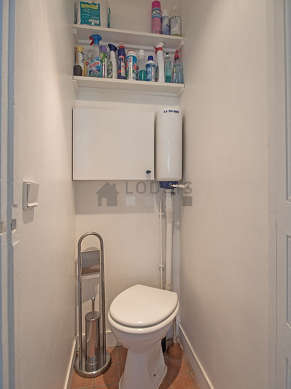 Cet appartement est équipé d'une salle de bain agréable. Cette salle d'eau bénéficie du nécessaire pour votre bien-être au quotidien : serviettes de bain, etagère, placard, baignoire, lave main, porte serviettes. Les toilettes sont séparées de la salle de bain et situées dans une pièce indépendante.