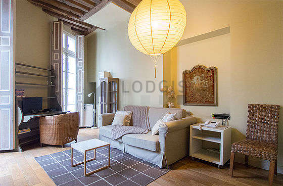 Cet appartement est composé d'un séduisant salon avec du parquet au sol et des fenêtres double vitrage et vue sur rue. Ce salon est meublé et équipé pour rendre votre séjour agréable : télé, réfrigerateur, canapé, 1 fauteuil(s), table à manger, table basse, bureau, penderie, etagère, placard, vaisselle, poutre, 5 chaise(s).