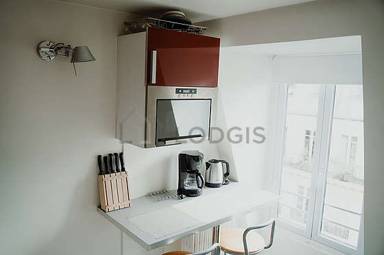Cet appartement dispose d'une belle cuisine avec du carrelage au sol et tout l'équipement nécessaire pour votre quotidien : plaques de cuisson, réfrigerateur, four, micro ondes, freezer, hotte, grille pain, bouilloire électrique, cafetière, etagère, placard, vaisselle, 2 chaise(s), bar.