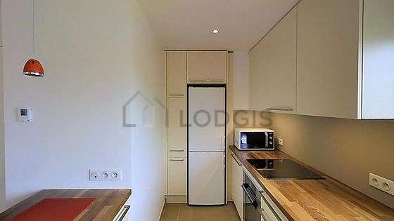 Cet appartement dispose d'une magnifique cuisine avec du carrelage au sol et tout l'équipement nécessaire pour votre quotidien : plaques de cuisson, réfrigerateur, congélateur, four, micro ondes, hotte, grille pain, bouilloire électrique, cafetière, placard, vaisselle, tabouret, bar, assiettes creuses, assiettes à dessert, assiettes plates, bol, casserole, couteaux de cuisine, couvercle, couverts, cuillère en bois, dessous de plat, econome, louche, lustre, marmitte, ouvre-boite, passoire, plan de travail, plat à four, plat de service, poêle, poubelle, saladier, spot encastré, tasses à café, verre à eau, verre à vin.