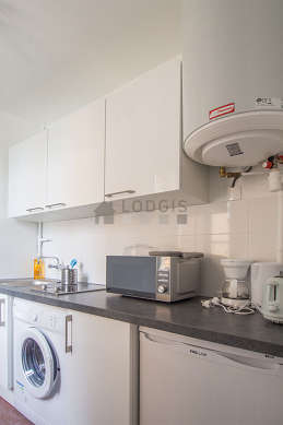 Cet appartement dispose d'une belle cuisine avec du carrelage au sol et tout l'équipement nécessaire pour votre quotidien : plaques de cuisson, réfrigerateur, micro onde combiné, freezer, grille pain, bouilloire électrique, cafetière, table à manger, vaisselle, tabouret.
