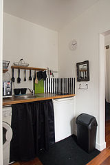 Cet appartement dispose d'une magnifique cuisine avec du parquet au sol et tout l'équipement nécessaire pour votre quotidien : plaques de cuisson, réfrigerateur, micro onde combiné, freezer, bouilloire électrique, cafetière, table à manger, etagère, armoire, placard, vaisselle, porte serviettes, poubelle.