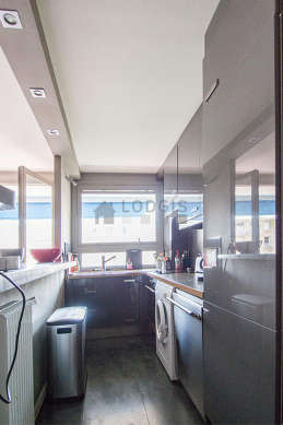 Cet appartement dispose d'une belle cuisine avec du parquet au sol et tout l'équipement nécessaire pour votre quotidien : plaques de cuisson, réfrigerateur, congélateur, four, micro ondes, grille pain, bouilloire électrique, cafetière, placard, vaisselle, bar.