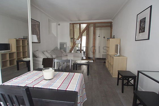 SéjourCet appartement est composé d'un séduisant salon avec du parquet au sol et des fenêtres double vitrage et vue sur rue. Ce salon calme est meublé et équipé pour rendre votre séjour agréable : télé, canapé, table à manger, placard, poutre, 1 chaise(s), affiche, meuble tv, rideaux, tableau1 canapé(s) lit(s) de 140cm.
