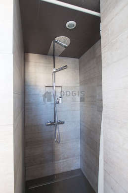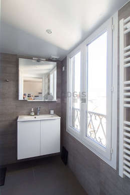 Cet appartement est équipé d'une salle de bain magnifique et très claire. Cette salle d'eau bénéficie du nécessaire pour votre bien-être au quotidien : serviettes de bain, placard, douche séparée, sèche cheveux, sanibroyeur, lavabo, radiateur sèche-serviettes. Les toilettes sont intégrées dans la salle de bain.