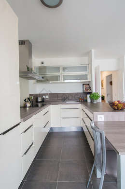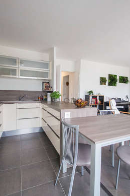 Cet appartement dispose d'une belle cuisine avec du carrelage au sol et tout l'équipement nécessaire pour votre quotidien : plaques de cuisson, réfrigerateur, congélateur, four, micro ondes, hotte, grille pain, bouilloire électrique, cafetière, table à manger, placard, vaisselle, robot ménager, 4 chaise(s).