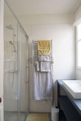 Cet appartement est équipé d'une salle de bain magnifique et claire. Cette salle d'eau bénéficie du nécessaire pour votre bien-être au quotidien : serviettes de bain, etagère, douche séparée, lavabo, radiateur sèche-serviettes. Les toilettes sont séparées de la salle de bain et situées dans une pièce indépendante.