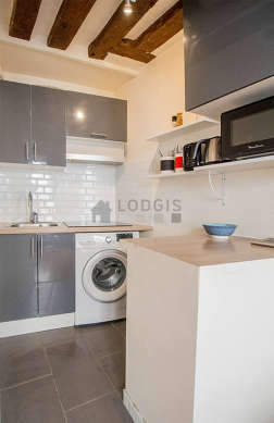 Cet appartement dispose d'une magnifique cuisine avec du carrelage au sol et tout l'équipement indispensable pour votre quotidien : plaques de cuisson, réfrigerateur, micro ondes, freezer, bouilloire électrique, etagère, placard, vaisselle.
