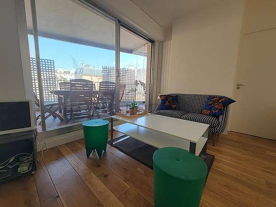 Cet appartement est composé d'un plaisant salon avec du parquet au sol et des fenêtres avec balcon et vue sur rue. Ce salon calme est meublé et équipé pour rendre votre séjour agréable : télé, canapé, table basse, 2 chaise(s), meuble tv.
