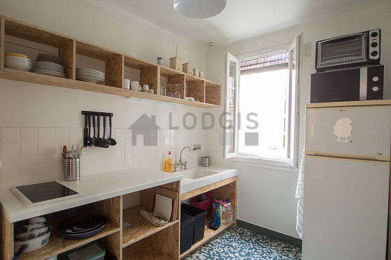 Cet appartement dispose d'une magnifique cuisine avec du carrelage au sol et tout l'équipement nécessaire pour votre quotidien : plaques de cuisson, réfrigerateur, four, micro ondes, grille pain, bouilloire électrique, cafetière, etagère, placard, vaisselle.