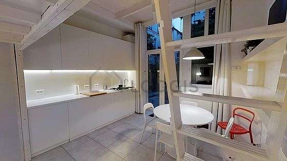 Cet appartement dispose d'une cuisine sur le séjour avec du carrelage au sol et tout l'équipement indispensable pour votre quotidien : plaques de cuisson, réfrigerateur, micro ondes, freezer, grille pain, bouilloire électrique, cafetière, vaisselle, bar.