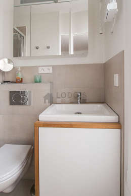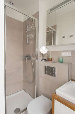 Cet appartement est équipé d'une salle de bain agréable et claire avec des fenêtres double vitrage. Cette salle d'eau bénéficie du nécessaire pour votre bien-être au quotidien : serviettes de bain, placard, douche séparée, sèche cheveux, lavabo, radiateur sèche-serviettes. Les toilettes sont intégrées dans la salle de bain.
