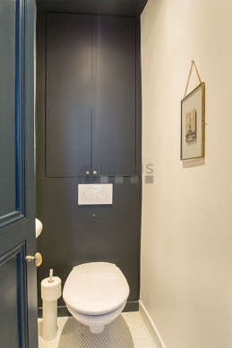 Cet appartement est équipé d'une salle de bain agréable. Cette salle d'eau bénéficie du nécessaire pour votre bien-être au quotidien : serviettes de bain, etagère, placard, lave main, radiateur sèche-serviettes. Les toilettes sont séparées de la salle de bain et situées dans une pièce indépendante.