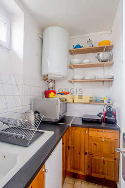 Cet appartement dispose d'une magnifique cuisine avec du carrelage au sol et tout l'équipement nécessaire pour votre quotidien : micro onde combiné, grille pain, bouilloire électrique, cafetière.