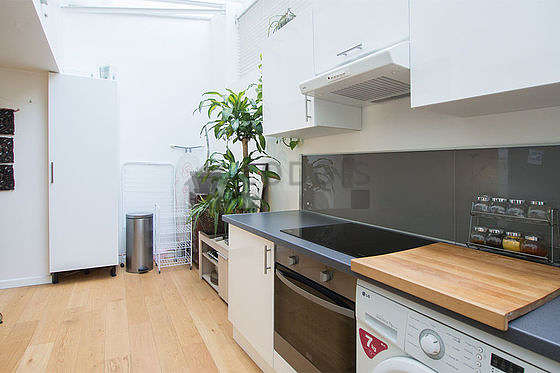 Cet appartement dispose d'une magnifique cuisine sur le séjour avec du parquet au sol et tout l'équipement nécessaire pour votre quotidien : plaques de cuisson, réfrigerateur, congélateur, four, micro ondes, hotte, grille pain, bouilloire électrique, cafetière, placard, vaisselle.