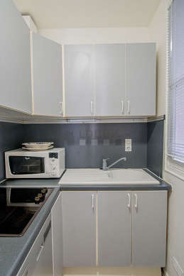 Cet appartement dispose d'une magnifique cuisine avec du carrelage au sol et tout l'équipement indispensable pour votre quotidien : plaques de cuisson, réfrigerateur, congélateur, four, micro ondes, hotte, grille pain, bouilloire électrique, cafetière, etagère, placard, vaisselle.