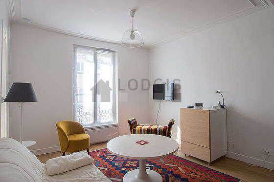 Cet appartement est composé d'un beau salon avec du parquet au sol vue sur rue. Ce salon calme est meublé et équipé pour rendre votre séjour agréable : télé, canapé, 1 fauteuil(s), table basse, etagère.
