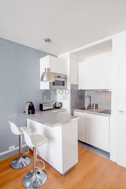 Cet appartement dispose d'une magnifique cuisine avec du carrelage au sol et tout l'équipement nécessaire pour votre quotidien : plaques de cuisson, réfrigerateur, micro onde combiné, freezer, etagère, placard, vaisselle, tabouret, bar.