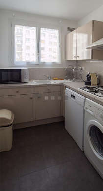 Cet appartement dispose d'une belle cuisine avec du carrelage au sol et tout l'équipement essentiel pour votre quotidien : plaques de cuisson, réfrigerateur, congélateur, four, micro ondes, hotte, cafetière, placard, vaisselle.