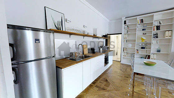Cet appartement dispose d'une magnifique cuisine avec du parquet au sol et tout l'équipement nécessaire pour votre quotidien : plaques de cuisson, réfrigerateur, congélateur, four, micro ondes, hotte, grille pain, bouilloire électrique, cafetière, table à manger, etagère, vaisselle, 6 chaise(s).