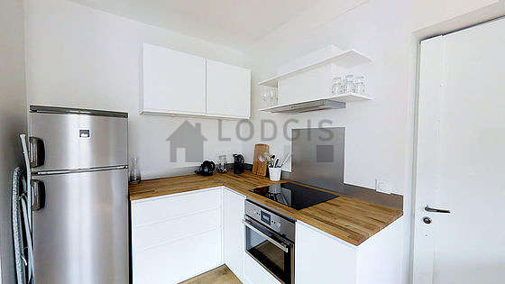 Cet appartement dispose d'une magnifique cuisine avec du parquet au sol et tout l'équipement indispensable pour votre quotidien : plaques de cuisson, réfrigerateur, congélateur, four, hotte, grille pain, bouilloire électrique, cafetière, table à manger, etagère, placard, vaisselle, 2 chaise(s).