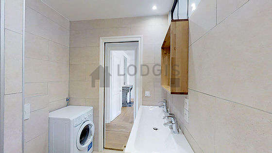 Cet appartement est équipé d'une salle de bain magnifique et claire. Cette salle d'eau bénéficie du nécessaire pour votre bien-être au quotidien : serviettes de bain, etagère, placard, douche séparée, sèche cheveux, lavabo, radiateur sèche-serviettes. Les toilettes sont intégrées dans la salle de bain.