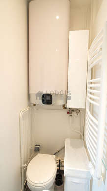 Cet appartement est équipé d'une salle de bain magnifique et claire. Cette salle d'eau bénéficie du nécessaire pour votre bien-être au quotidien : serviettes de bain, etagère, armoire, douche séparée, sanibroyeur, lavabo, radiateur sèche-serviettes. Les toilettes sont intégrées dans la salle de bain.