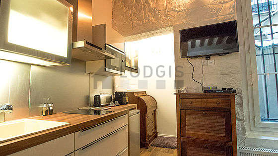 Cet appartement dispose d'une magnifique cuisine avec du parquet au sol et tout l'équipement essentiel pour votre quotidien : plaques de cuisson, réfrigerateur, congélateur, micro ondes, freezer, hotte, grille pain, bouilloire électrique, cafetière, placard, vaisselle.