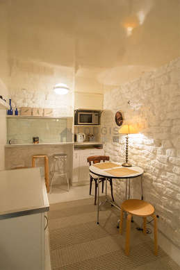 Cet appartement dispose d'une belle cuisine avec du carrelage au sol et tout l'équipement indispensable pour votre quotidien : plaques de cuisson, réfrigerateur, micro onde combiné, freezer, hotte, grille pain, bouilloire électrique, table à manger, etagère, placard, vaisselle, 1 chaise(s), tabouret.