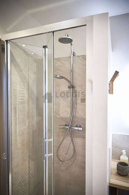 Cet appartement est équipé d'une salle de bain magnifique et claire. Cette salle d'eau bénéficie du nécessaire pour votre bien-être au quotidien : serviettes de bain, etagère, douche séparée, sèche cheveux, lavabo, radiateur sèche-serviettes. Les toilettes sont séparées de la salle de bain et situées dans une pièce indépendante.