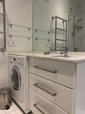 Cet appartement est équipé d'une salle de bain agréable et claire. Cette salle d'eau bénéficie du nécessaire pour votre bien-être au quotidien : serviettes de bain, etagère, armoire, placard, baignoire, sèche cheveux, lavabo. Les toilettes sont séparées de la salle de bain et situées dans une pièce indépendante.