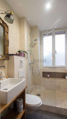 Cet appartement est équipé d'une salle de bain magnifique et claire. Cette salle d'eau bénéficie du nécessaire pour votre bien-être au quotidien : serviettes de bain, etagère, placard, douche séparée, sèche cheveux, lavabo, radiateur sèche-serviettes. Les toilettes sont intégrées dans la salle de bain.