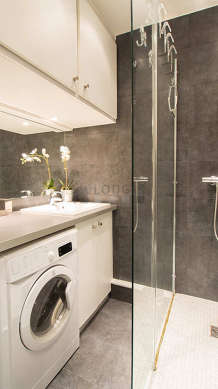 Cet appartement est équipé d'une salle de bain magnifique et claire. Cette salle d'eau bénéficie du nécessaire pour votre bien-être au quotidien : serviettes de bain, placard, douche séparée, lavabo. Les toilettes sont intégrées dans la salle de bain.