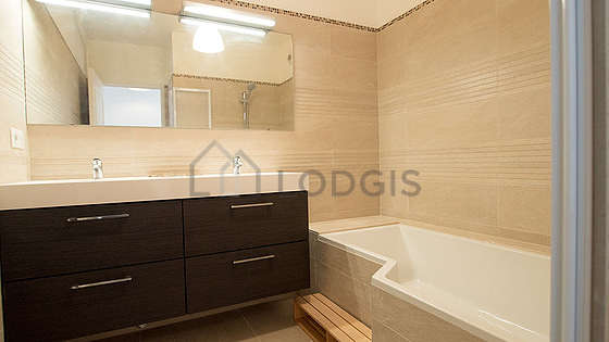 Cet appartement est équipé d'une salle de bain magnifique. Cette salle d'eau bénéficie du nécessaire pour votre bien-être au quotidien : serviettes de bain, placard, baignoire, lavabo. Les toilettes sont séparées de la salle de bain et situées dans une pièce indépendante.