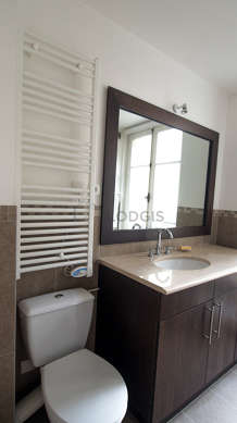 Cet appartement est équipé d'une salle de bain magnifique et claire. Cette salle d'eau bénéficie du nécessaire pour votre bien-être au quotidien : serviettes de bain, placard, douche séparée, sèche cheveux, lavabo, radiateur sèche-serviettes. Les toilettes sont intégrées dans la salle de bain.