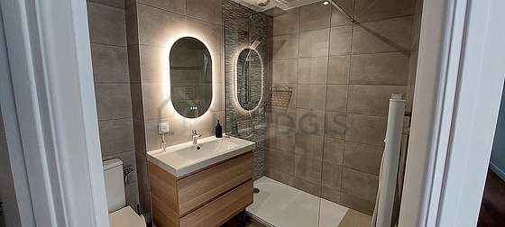 Cet appartement est équipé d'une salle de bain magnifique. Cette salle d'eau bénéficie du nécessaire pour votre bien-être au quotidien : serviettes de bain, armoire, baignoire, sèche cheveux, lavabo, radiateur sèche-serviettes. Les toilettes sont intégrées dans la salle de bain.