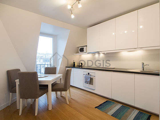 Cet appartement dispose d'une magnifique cuisine avec du parquet au sol et tout l'équipement nécessaire pour votre quotidien : plaques de cuisson, réfrigerateur, four, micro ondes, freezer, hotte, bouilloire électrique, cafetière, table à manger, placard, vaisselle, 4 chaise(s).