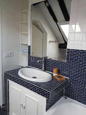 Cet appartement est équipé d'une salle de bain magnifique et claire avec des fenêtres. Cette salle d'eau bénéficie du nécessaire pour votre bien-être au quotidien : etagère, placard, baignoire, sèche cheveux, lavabo, miroir, porte serviettes. Les toilettes sont intégrées dans la salle de bain.