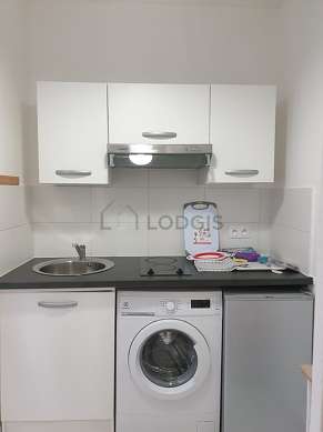 Cet appartement dispose d'une magnifique cuisine avec du carrelage au sol et tout l'équipement indispensable pour votre quotidien : plaques de cuisson, réfrigerateur, micro ondes, freezer, hotte, penderie, etagère, armoire, placard, vaisselle, 1 chaise(s).