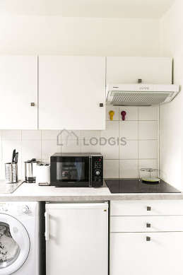 Cet appartement dispose d'une cuisine et tout l'équipement indispensable pour votre quotidien : réfrigerateur, micro ondes, vaisselle.