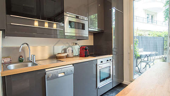 Cet appartement dispose d'une belle cuisine avec du carrelage au sol et tout l'équipement essentiel pour votre quotidien : plaques de cuisson, réfrigerateur, congélateur, four, micro ondes, hotte, grille pain, bouilloire électrique, cafetière, placard, vaisselle, 1 chaise(s), bar.