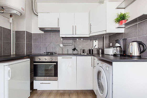 Cet appartement dispose d'une magnifique cuisine avec du parquet au sol et tout l'équipement essentiel pour votre quotidien : plaques de cuisson, réfrigerateur, four, hotte, grille pain, cafetière, etagère, placard, vaisselle, poubelle.