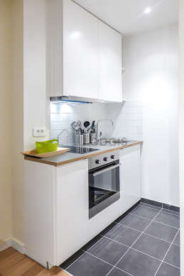 Cet appartement dispose d'une cuisine avec du carrelage au sol et tout l'équipement indispensable pour votre quotidien : réfrigerateur, four, micro ondes, freezer, grille pain, vaisselle.