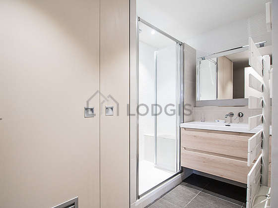 Cet appartement est équipé d'une salle de bain magnifique. Cette salle d'eau bénéficie du nécessaire pour votre bien-être au quotidien : penderie, etagère, placard, douche séparée, lavabo, miroir. Les toilettes sont intégrées dans la salle de bain.