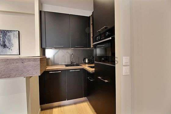 Cet appartement dispose d'une cuisine avec du parquet au sol et tout l'équipement essentiel pour votre quotidien : plaques de cuisson, réfrigerateur, micro onde combiné, freezer, hotte, grille pain, cafetière, placard, vaisselle, bar, poubelle.