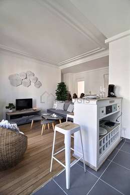 SéjourCet appartement est composé d'un superbe salon avec du parquet au sol et des fenêtres double vitrage. Ce salon très calme est meublé et équipé pour rendre votre séjour agréable : télé, canapé, 1 fauteuil(s), lampadaire sur pied, meuble tv, table gigogne.