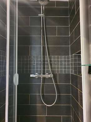 Cet appartement dispose d'une magnifique cuisine avec de la tomettes au sol et tout l'équipement essentiel pour votre quotidien : plaques de cuisson, micro ondes, grille pain, bouilloire électrique, cafetière, etagère, placard, vaisselle, tabouret, bar.