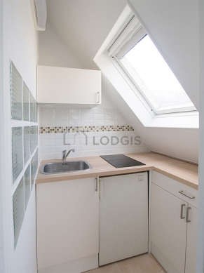 Cet appartement dispose d'une belle cuisine avec du carrelage au sol et tout l'équipement essentiel pour votre quotidien : plaques de cuisson, réfrigerateur, placard, vaisselle.